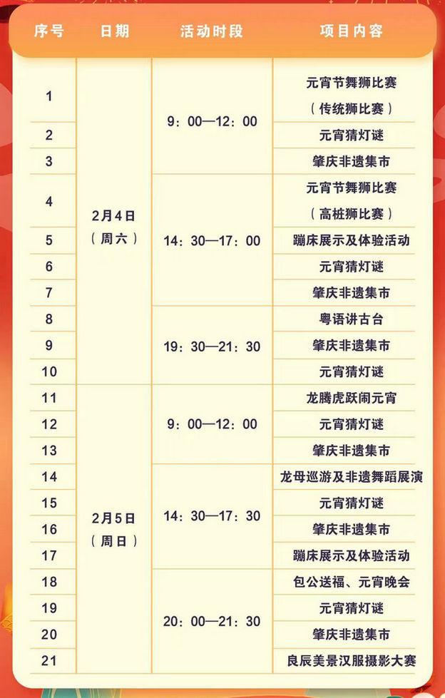 龙狮嬉元宵则于2月5日10:00-12:00在包公文化园文化广场进行。届时舞龙队、青少年舞狮队、武术队伍在广场进行表演,展示非遗在年轻一代中的接力与传承。